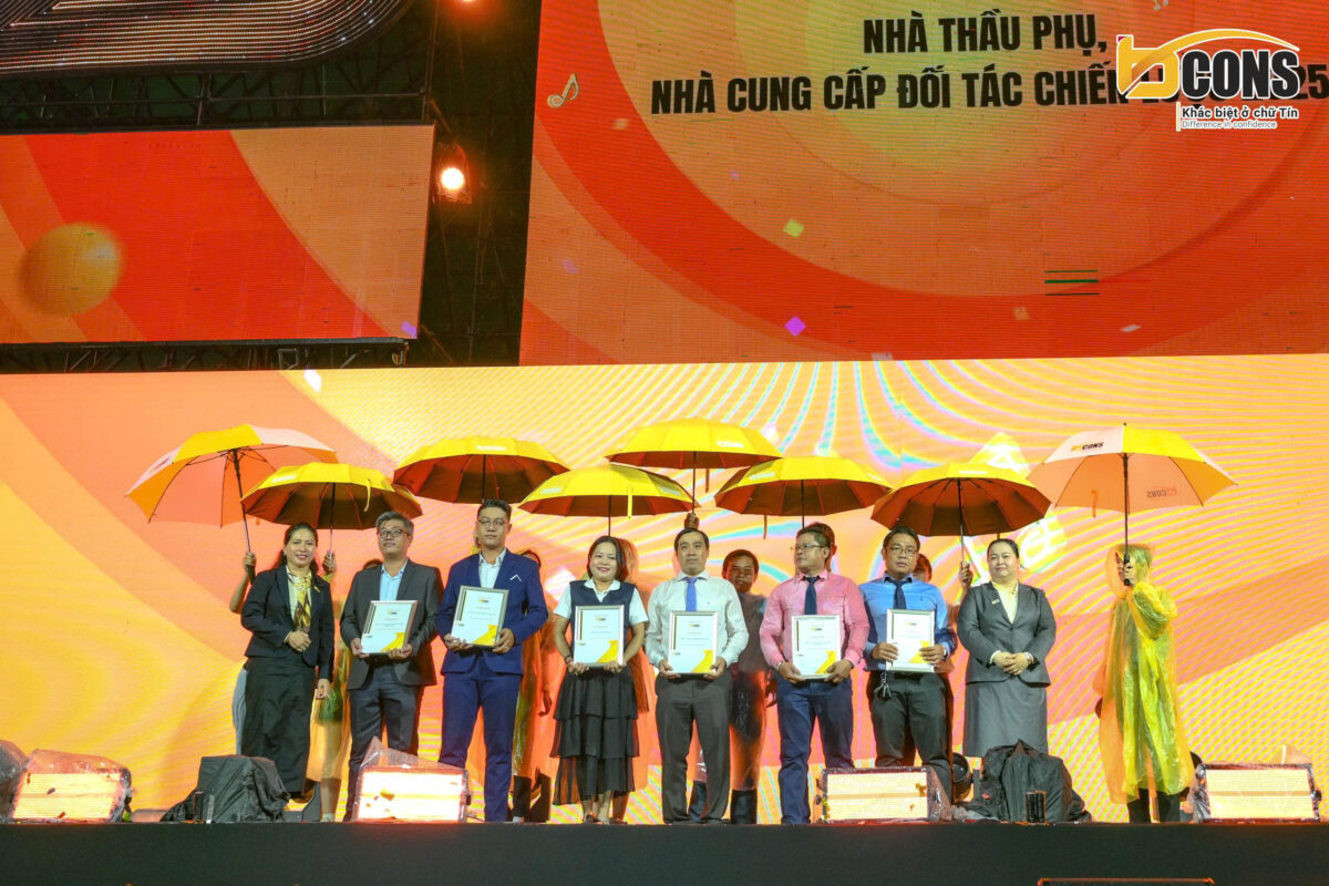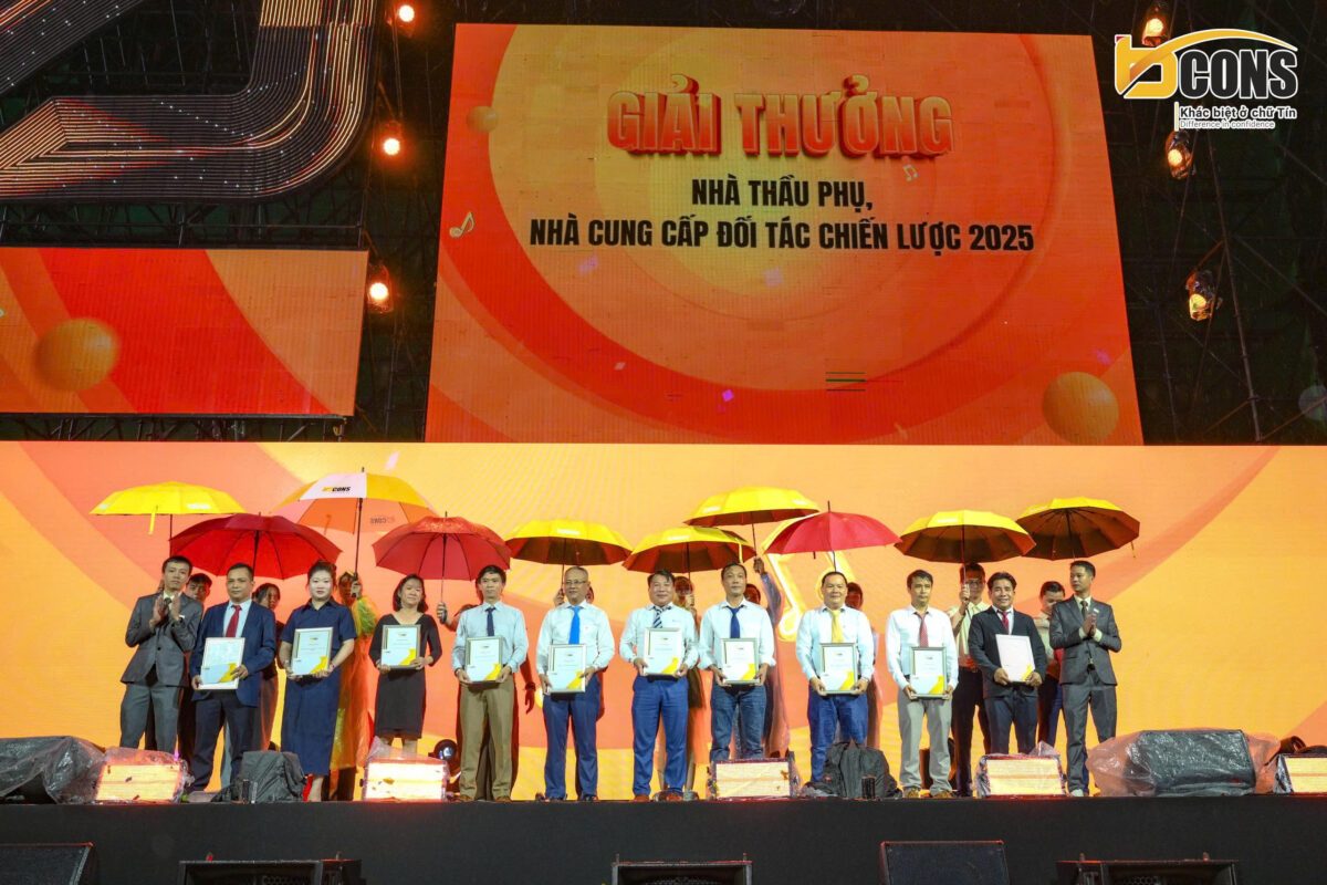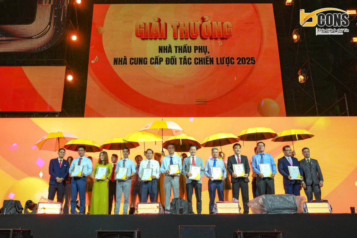 Trong chương trình, Tập đoàn Bcons đã tri ân và vinh danh tổng cộng 40 đơn vị tiêu biểu, gồm 36 nhà thầu, nhà cung cấp có nhiều đóng góp nổi bật trong năm 2025, cùng 04 sàn phân phối xuất sắc: Bcons Homes, Bcons PS, Teraland và Sao Việt – những đơn vị đã đạt thành tích ấn tượng trong hoạt động kinh doanh và lan tỏa thương hiệu Bcons đến đông đảo khách hàng.